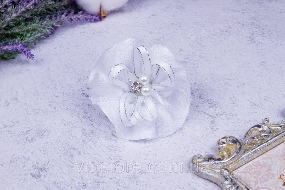 Гарний ніжний бант атлас з мереживом прикрашений стразами та перлами, на гумці